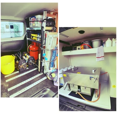 Inside the centre section is a tool and cleaning equipment store and in the rear section is a our specially designed gas heated dip tank. The solution in the tank (bio and eco friendly, of course, there's no caustic nastiness here!) is used to soak the internal parts of ovens and hobs and gently lift away baked on deposits and grease. It really is amazing to see how clean they come out of the tank!